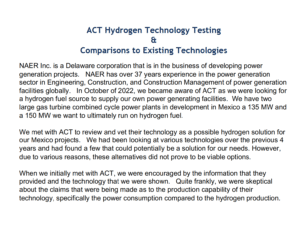 n 2022, NAER conducted their own independent testing of our technology and were amazed by the potential efficiencies and hydrogen production they observed.