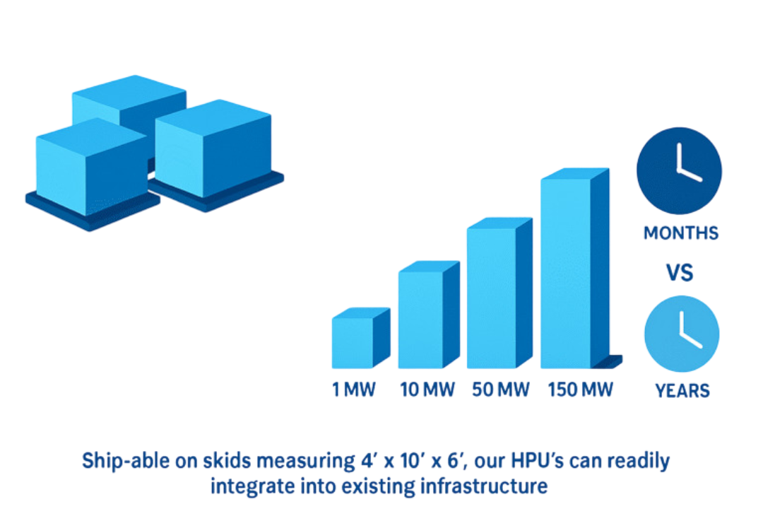 Two HPU units providing 1+ MW each can be shipped in a single shipping container with a similar footprint when installed. Our design allows for scaling up to 200 MW and beyond as required.